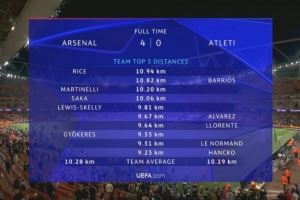 赛后两队跑动数据显示,阿森纳全队平均跑动距离为10.28KM略高于马竞的10.19KM。但是,在跑动距离超过10KM的球员中,阿森纳有3人,分别为赖斯(全场最高10.94KM)、马丁内利和萨卡,而马竞仅有1人为巴里奥斯。